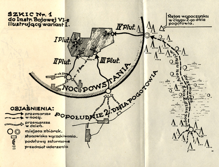 Wydana przez Tajne Wojskowe Zakłady Wydawnicze instrukcja bojowa „Mobilizacja i doprowadzenie oddziałów do walki”, mapka ilustrująca przewidywany rozwój wydarzeń, ze zb. Marka Ney-Krwawicza