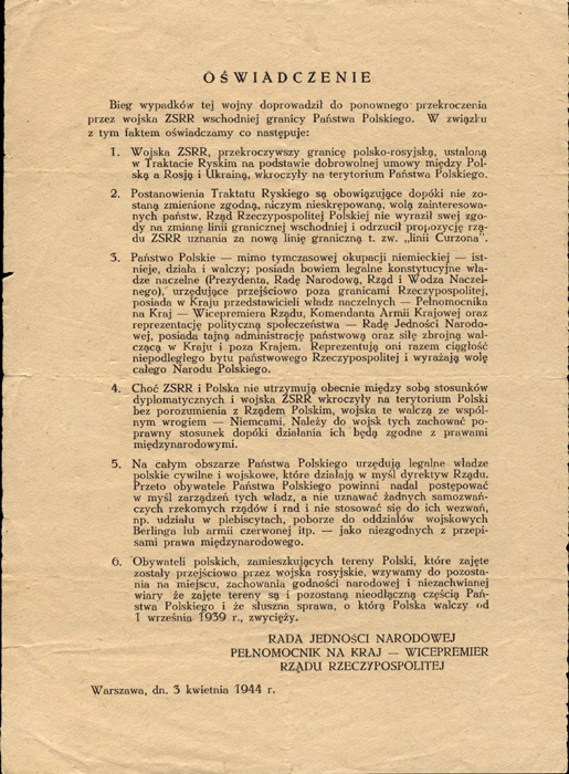 Oświadczenie Rady Jedności Narodowej z 3 kwietnia 1944 r. o przekroczeniu granicy państwa przez Sowietów, ze zb. Marka Ney-Krwawicza |