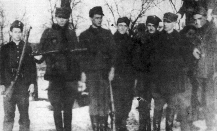 Ppłk Jan Wojciech Kiwerski „Oliwa” (szósty z lewej) wśród żołnierzy kompanii łączności 27. WDP AK,