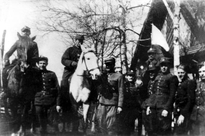 Na białym koniu dowódca Zgrupowania Nadniemeńskiego ppłk dypl. Maciej Kalenkiewicz „Kotwicz”, obok niego konno ppor. Stanisław Baranowicz „Bartek” dowódca 2. kompanii I batalionu 77. pp AK ze swoimi żołnierzami, Mciewczuki, luty 1944; ze zb. Muzeum Armii Krajowej Okręgu Wilno „Wiano”