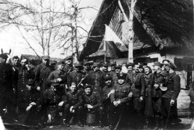 Oficerowie i żołnierze I batalionu 77. pp AK na koncentracji, stoją od lewej kpr. Zenon Wasiewicz „Orzeł”, kpr. Michał Budrewicz „Organista”, plut. Tadeusz Jarmołowicz „Kościuszko”, kpr. Władysław Grobicki „Longin”, plut. NN „Wątróbka”, ppor. Kazimierz Dogiel „Sawko”, ppor. NN „Bartek”, ppor. Jerzy Dąbrowski „Dąb”, ppor. Jan Wasiewicz „Lew”, plut. Michał Sągayłło „Mściwój”, ppłk dypl. Maciej Kalenkiewicz „Kotwicz”, kpt. Władysław Żogło „Zych”, kpr. Olgierd Lewicki „Rogala”, st. strz. Stanisław Cholewa „Oczkow”, kpr. pchor. Wiesław Nowocień „Jastrzębiec”, sanitariuszka Henryka Tarnawska „Katarzyna”, ppor. Józef Werdaszko „Bruzda”, plut. NN „Wykonawczy”, sierż. Stanisław Podzieliński „Sosna”, klęczą kpr. NN „Franek”, plut. Edward Barancewicz „Orłow”, st. strz. Jan Borysewicz „Janusz”, st. Sierż. Albin Klim „Bratek” i najmłodszy żołnierz Brygady strz. NN „Dobosz”, Mociewczuki, luty 1944;