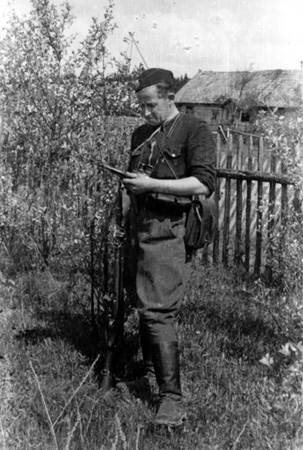 Władysław Chojecki „Podbipięta” z mapą w ręku planuje trasę marszu 5. Brygady Wileńskiej;