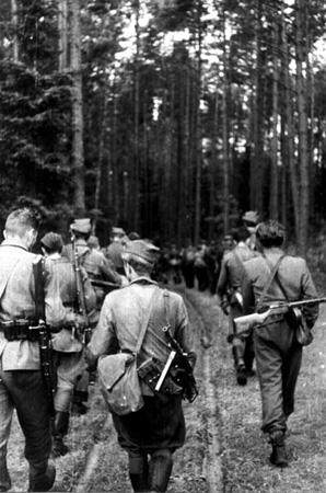 Żołnierze 6. Samodzielnej Brygady Dyspozycyjnej w marszu przez Puszczę Rudnicką, 18 lipiec 1944,