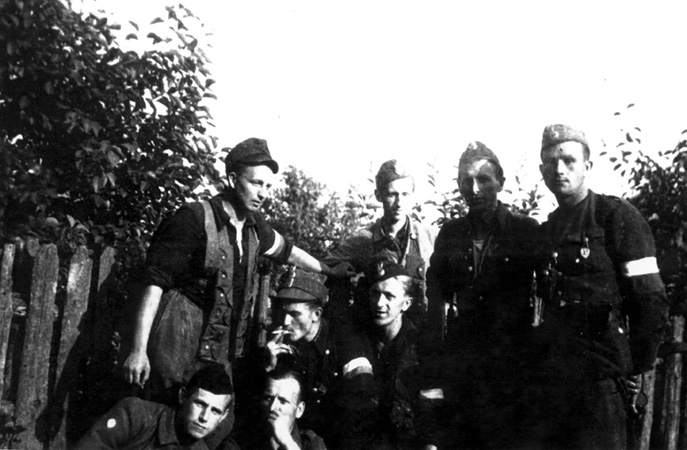 Żołnierze 7. Brygady, stoją od lewej: Michał Baniukiewicz, dwaj NN, Stanisław Lasmanowicz „Czardasz”, klęczą od lewej: Apolinary Kozakiewicz „Grot”, Henryk Dziekiewicz, poniżej S. Miedzyński i Antoni Minkowski „Andy”, ze zb. Muzeum Armii Krajowej Okręgu Wilno „Wiano” |