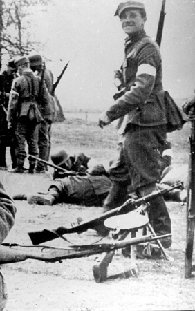 Odpoczynek żołnierzy 8. Brygady Wileńskiej przy odłożonych na bok karabinach maszynowych;