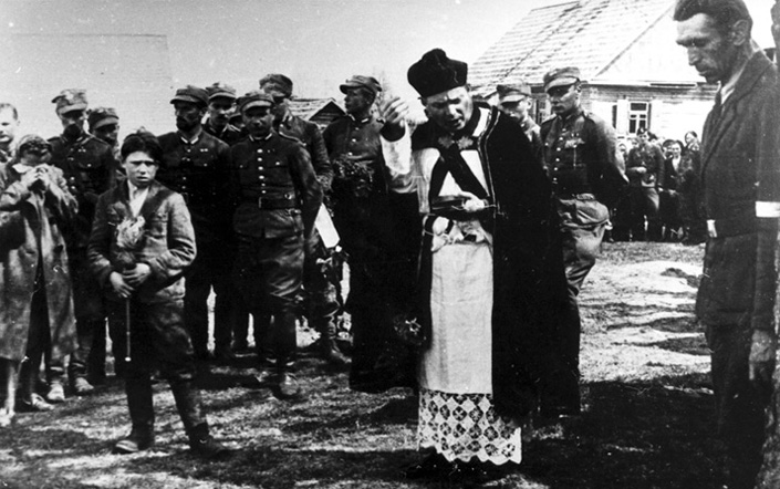 Ksiądz przemawiający nad mogiłą do żołnierzy 8. Brygady Wileńskiej;