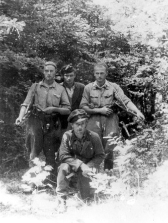 Żołnierze oddziału leśnego 2. kompanii 51. pp, stoją od lewej Miszek, NN, Wiktorczyk, klęczy Dynowski,