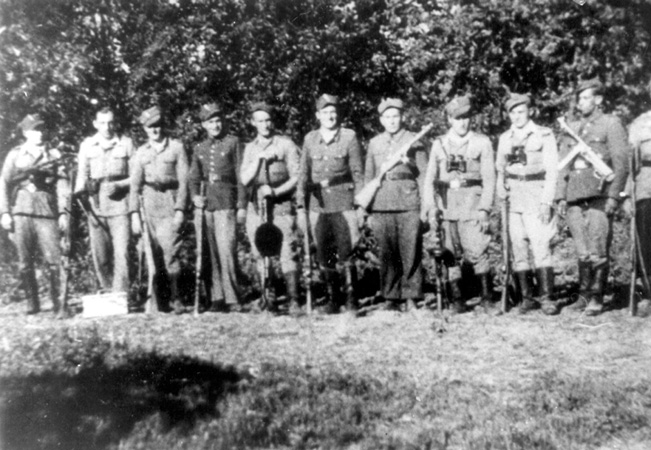 Żołnierze z obwodu L „Warty” jako milicjanci z posterunku w Nowej Grobli, pierwszy z lewej dowódca Stefan Trembicki „Jełbicki”, z kolekcji S. Trembickiego ze zbiorów Światowego Związku Żołnierzy Armii Krajowej Obszar Lwów