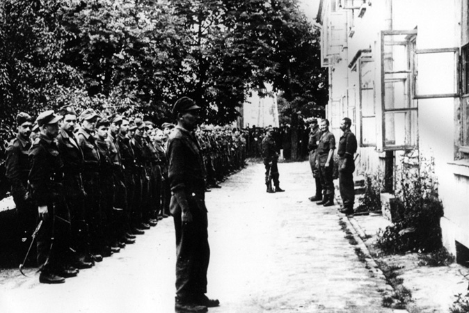 Kompania batalionu „Krwawa Łuna” 27. Wołyńskiej Dywizji Piechoty AK na zbiórce w Szczebrzeszynie, lipiec 1944, ze zb. Światowego Związku Żołnierzy Armii Krajowej Okręg Wołyń