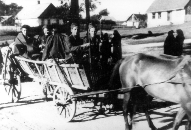 Tabor 8. kompanii 26. pp, na wozie sanitariuszki Ewa Szczepankiewiczówna „Małgosia” i Krystyna Dąbrowska „Jaś”, na przodzie z lewej kpr. Z. Gołdziński „Żbik”, obok niego Jerzy Kozłowski „Daniel”,