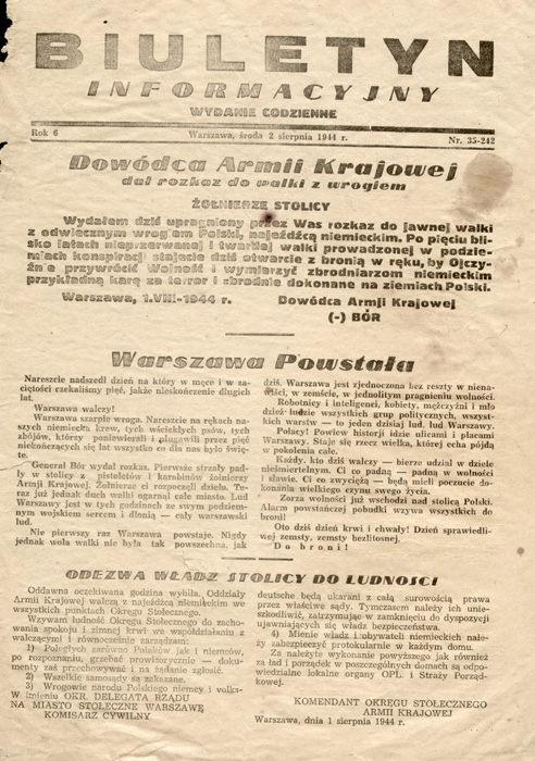 „Biuletyn Informacyjny” z 2 sierpnia 1944 r. z rozkazem Dowódcy Armii Krajowej gen. Tadeusza Komorowskiego „Bór” rozpoczynającym powstanie w Warszawie, ze zb. Marka Ney-Krwawicza