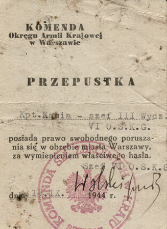 Przepustka kpt. Tadeusza Żenczykowskiego „Kowalik” upoważniająca go do poruszanie się po terenach opanowanych przez powstańców, ze zb. Marka Ney-Krwawicza