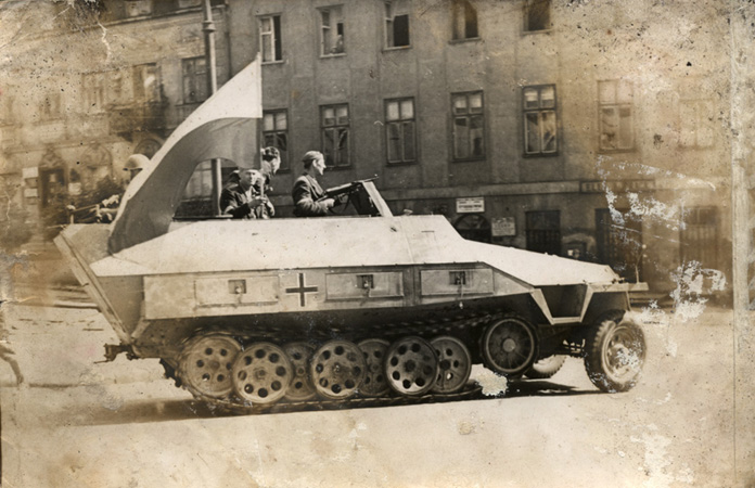 Zdobyczny transporter opancerzony w sierpniu 1944 r. na warszawskiej ulicy, ze zb. Marka Ney-Krwawicza
