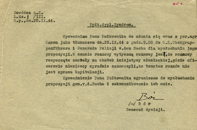 Upoważnienie dla jednego z oficerów Komendy Głównej do prowadzenia rozmów z Niemcami, ze zb. Marka Ney-Krwawicza
