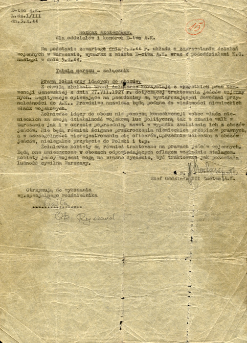 Rozkaz dla żołnierzy Armii Krajowej informujący o warunkach pójścia do niewoli, ze zb. Marka Ney-Krwawicza |