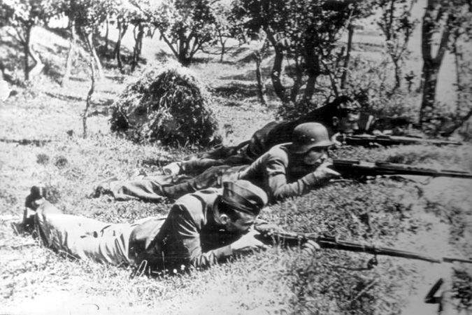 Żołnierze AK w czasie walki z ekspedycją niemiecką, która miała odblokować posterunki w powiecie pińczowskim, Jaksice, lipiec 1944, ze zb. Stanisława Piwowarskiego