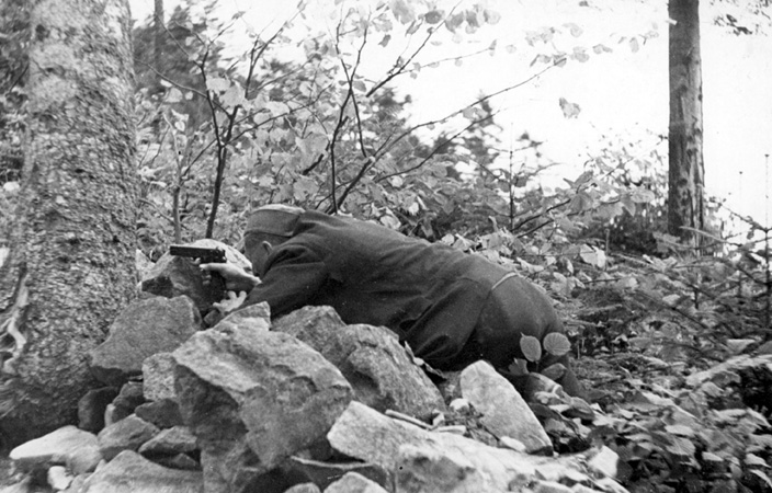 Tadeusz Ząbczyk „Zapolsza” z visem w ręku w czasie jednej z akcji, z kolekcji Zofii Horodyńskiej
