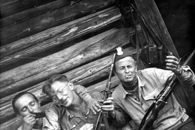Żołnierze z oddziału partyzanckiego „Prąd” w chwili odpoczynku, z kolekcji Zofii Horodyńskiej w zbiorach Muzeum Regionalnego „Dom Grecki” w Myślenicach