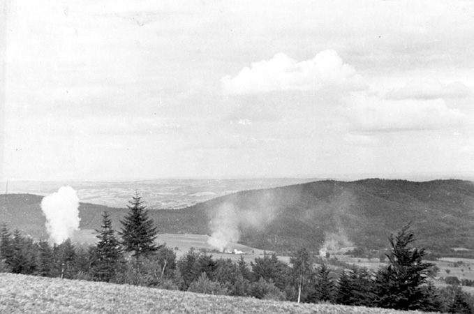 Płonące gospodarstwa w Glichowie, 18 września 1944 r., z kolekcji Zofii Horodyńskiej w zbiorach Muzeum Regionalnego „Dom Grecki” w Myślenicach