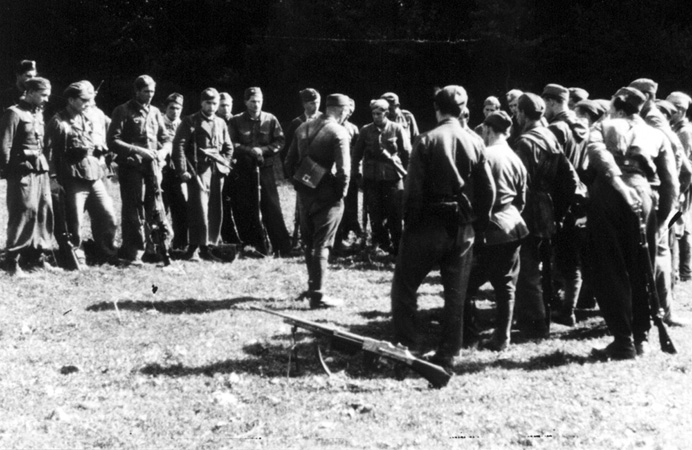 Pluton Czesława Ciepieli „Karp” (w centrum, odwrócony tyłem), od lewej stoją NN „Szczerbiec”, Józef Dubicki „Niedźwiedź”,, Włodzimierz Rozmus „Buńko”, NN „Gregorczyk”, Zbigniew Kurz „Żubr”, na pierwszym planie tyłem Stefan Włodek „Kot”, Leon Klaja „Lach”, Zygmunt Nikiel „Muniu”, ze zb. Światowego Związku Żołnierzy Armii Krajowej, Baon „Skała” |