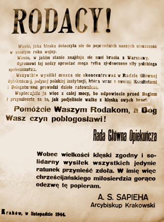 Afisz RGO i Kurii Metropolitalnej wzywający do udzielenia pomocy wysiedlonym ze zburzonego miasta warszawiakom, ze zbiorów Muzeum Historycznego Miasta Krakowa