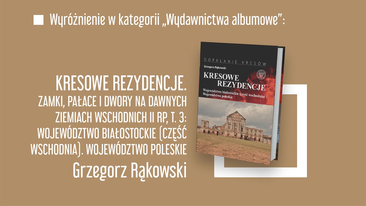 Wyróżnienie: Grzegorz Rąkowski, Kresowe rezydencje. Zamki, pałace i dwory na dawnych ziemiach wschodnich II RP, t. 3: Województwo białostockie (część wschodnia). Województwo poleskie, Warszawa 2022