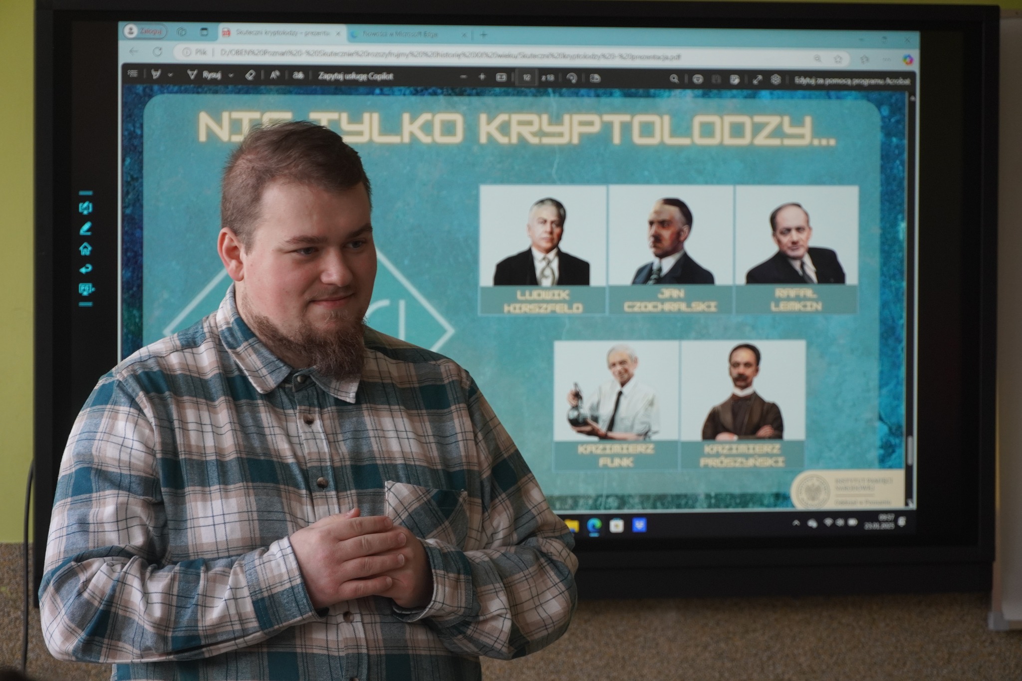 W pierwszej części spotkania odbyły się zajęcia „Skutecznie rozszyfrujmy historię XX wieku”, które przeprowadził Krystian Chrobak. W czasie inspirujących zajęć młodzi pasjonaci historii poznali sylwetki słynnych matematyków, „pogromców Enigmy”, oraz dowiedzieli się wielu ciekawostek związanych z pracą polskich kryptologów. Przede wszystkim tego, że to dzięki dokonaniom polskich naukowców II wojna światowa trwała dwa lata krócej! Podsumowaniem zajęć było zadanie „Giganci nauki”: młodzież pracując w grupach, zapoznała się z życiorysami polskich naukowców, którzy niestety często są zapominani. Następnie uczniowie musieli odnaleźć w skrzyni przedmiot, który był związany z pracą danego badacza. W ten sposób dzieci poznały wiele osiągnieć zapomnianych polskich naukowców, takich jak Ludwik Hirszfeld (wprowadził oznaczenia grupy krwi), Kazimierz Funk (twórca nauk o witaminach i autor terminu „witamina”, który jako pierwszy wyodrębnił witaminę B1) czy Kazimierz Prószyński (twórca pierwszej ręcznej kamery filmowej).