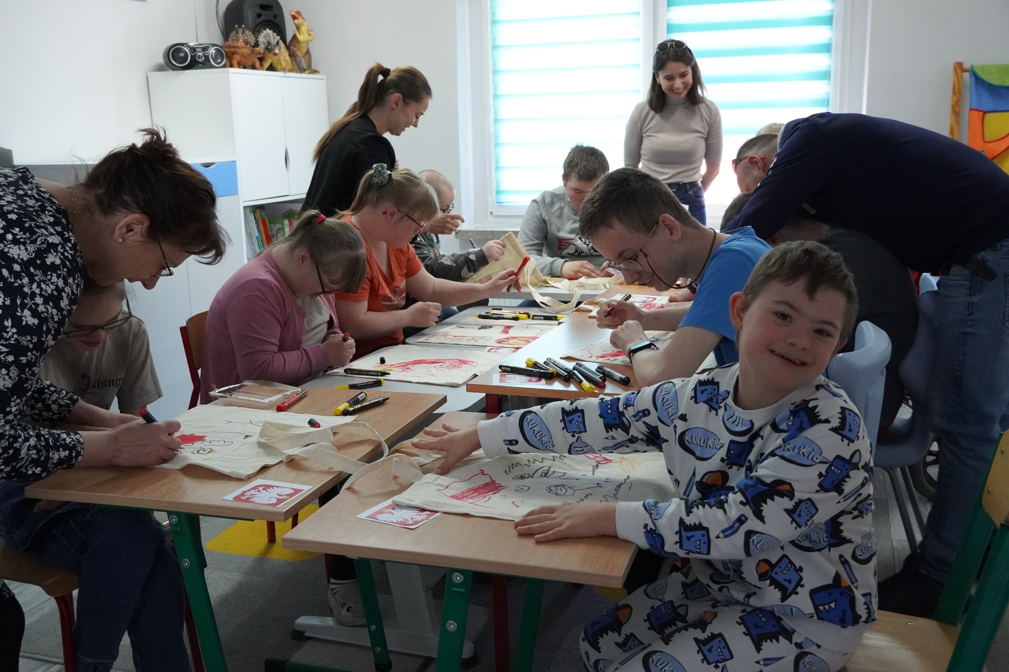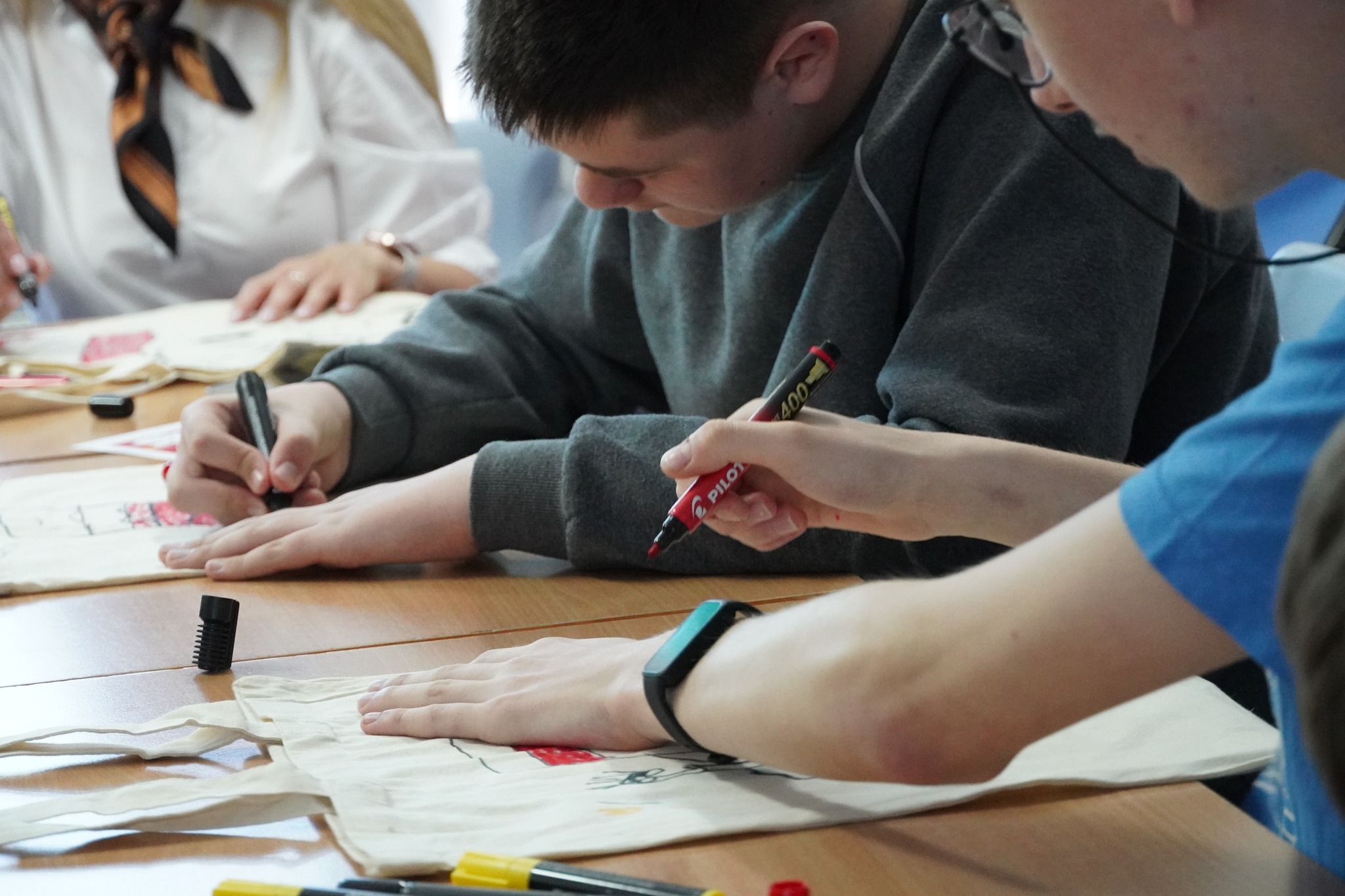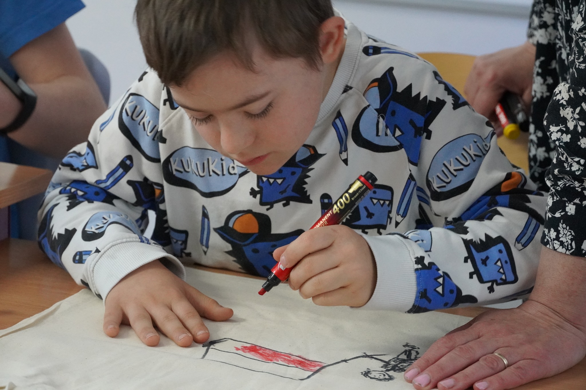Po części wprowadzającej nastąpiły zajęcia praktyczne, podczas których uczniowie ozdabiali torby materiałowe, wykorzystując motywy nawiązujące do poznanych symboli. Powstały pomysłowe i barwne prace, które, mamy nadzieję, będą wyjątkową pamiątką z warsztatów.