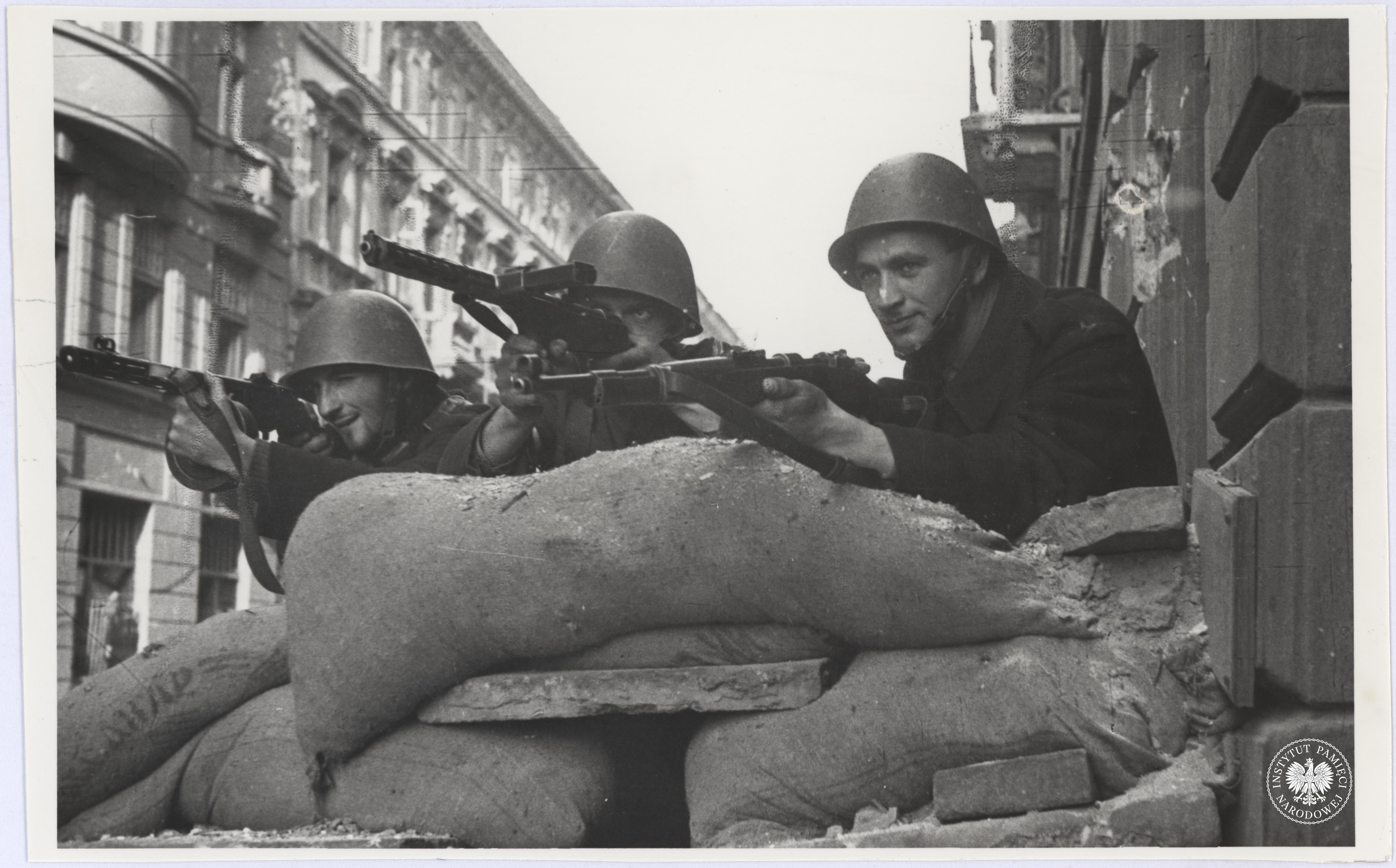 Trzech niezidentyfikowanych powstańców z nieustalonego oddziału AK stoi na jednej z ulic w Śródmieściu Północnym, fot. Henryk Śmigacz, z zasobu Archiwum IPN, sygn. IPNBU-2-21-28-3-1 -