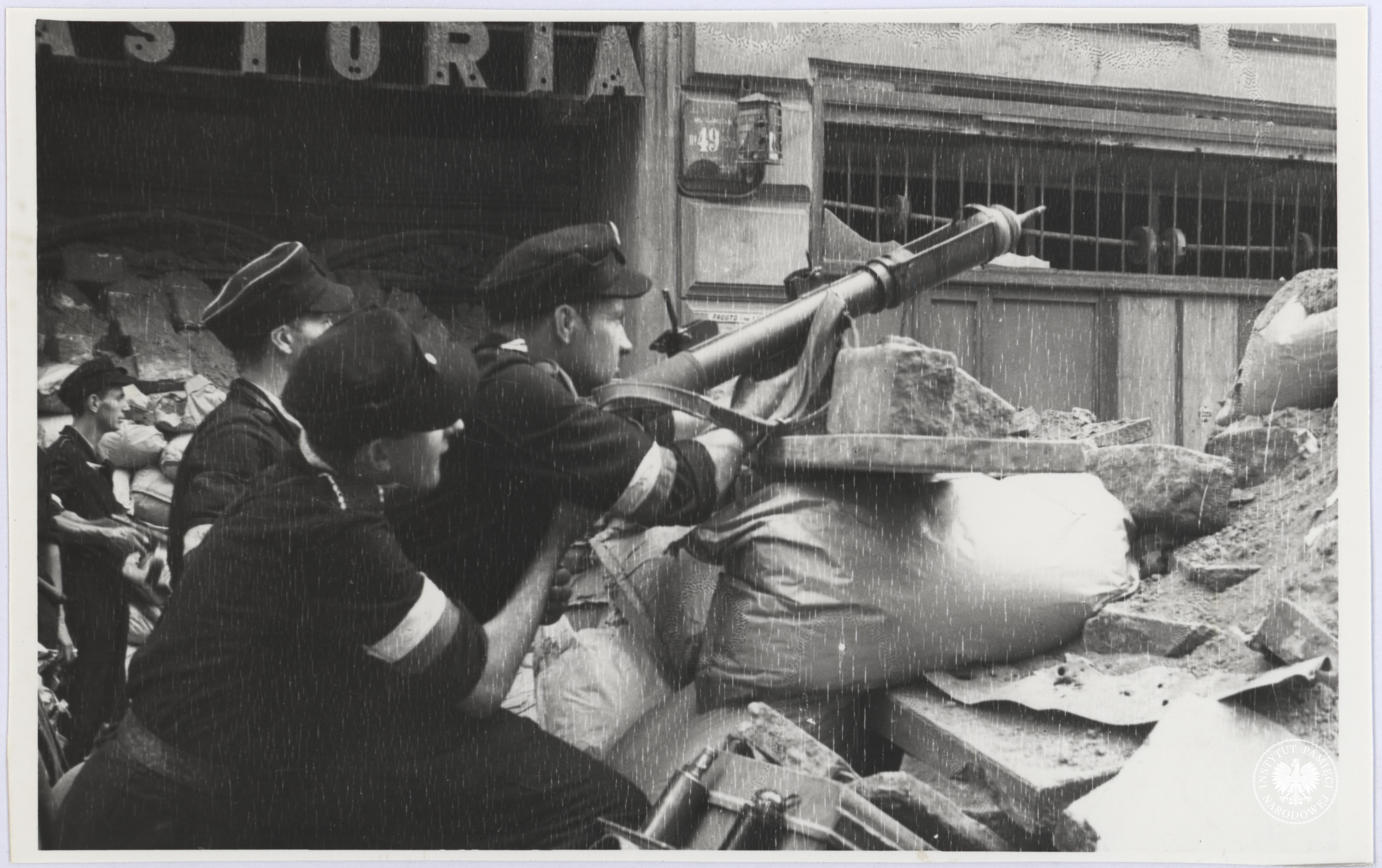 Kilku niezidentyfikowanych powstańców z nieustalonego oddziału AK na barykadzie na ul. Chmielnej między Hotelem Astoria a narożną kamienicą, fot. H. Śmigacz, z zasobu Aruchiwum IPN, sygn. IPNBU-2-21-26-3-1 -