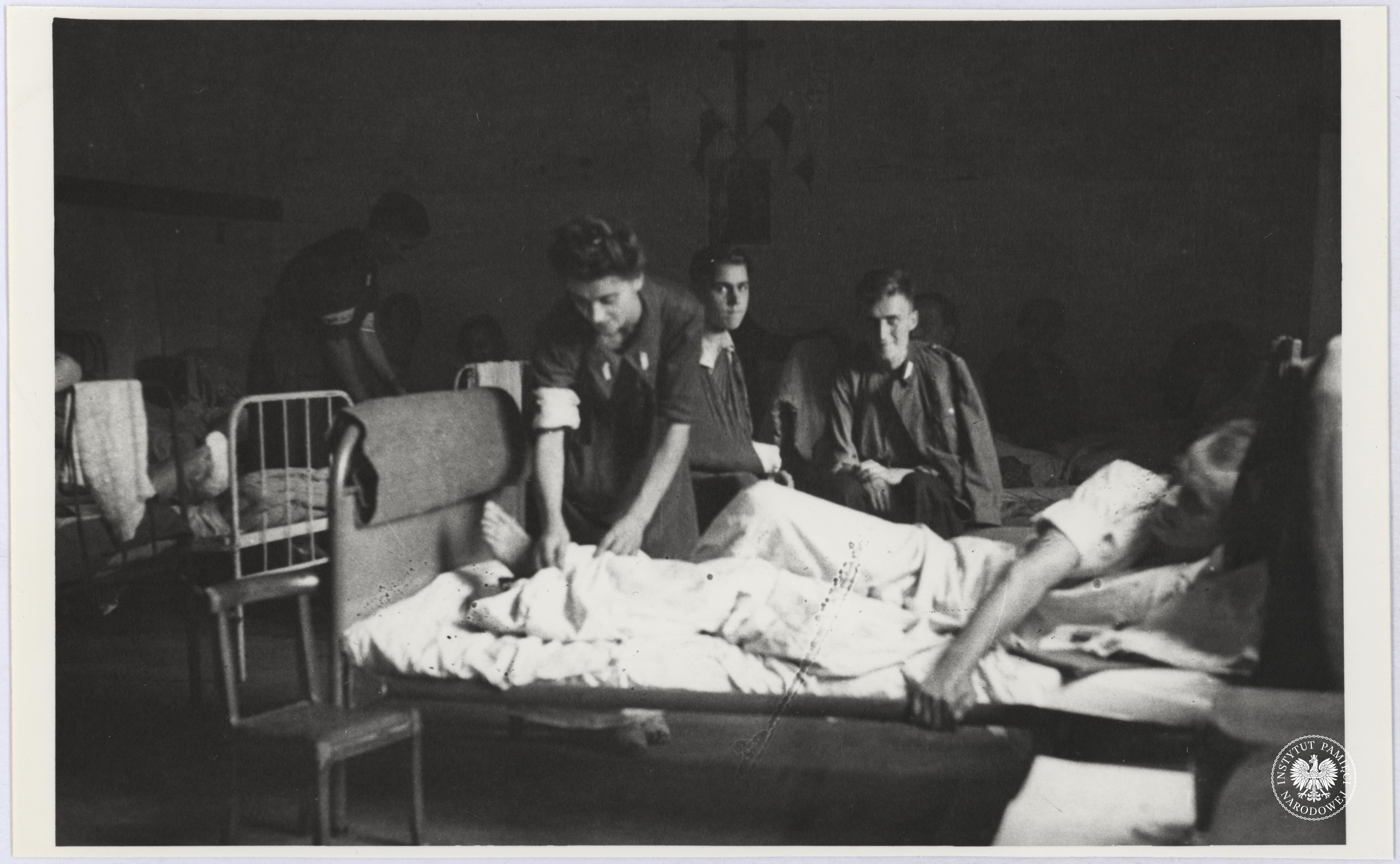 Ranni powstańcy z oddziału AK i sanitariuszki w sali jednego ze szpitali powstańczych IV Zgrup. Gurt przy ul. Złotej 22 lub 58, ewent. przy ul. Chmielnej, fot. H. Śmigacz, z zasobu IPN, sygn. IPNBU-2-21-32-1-1 -