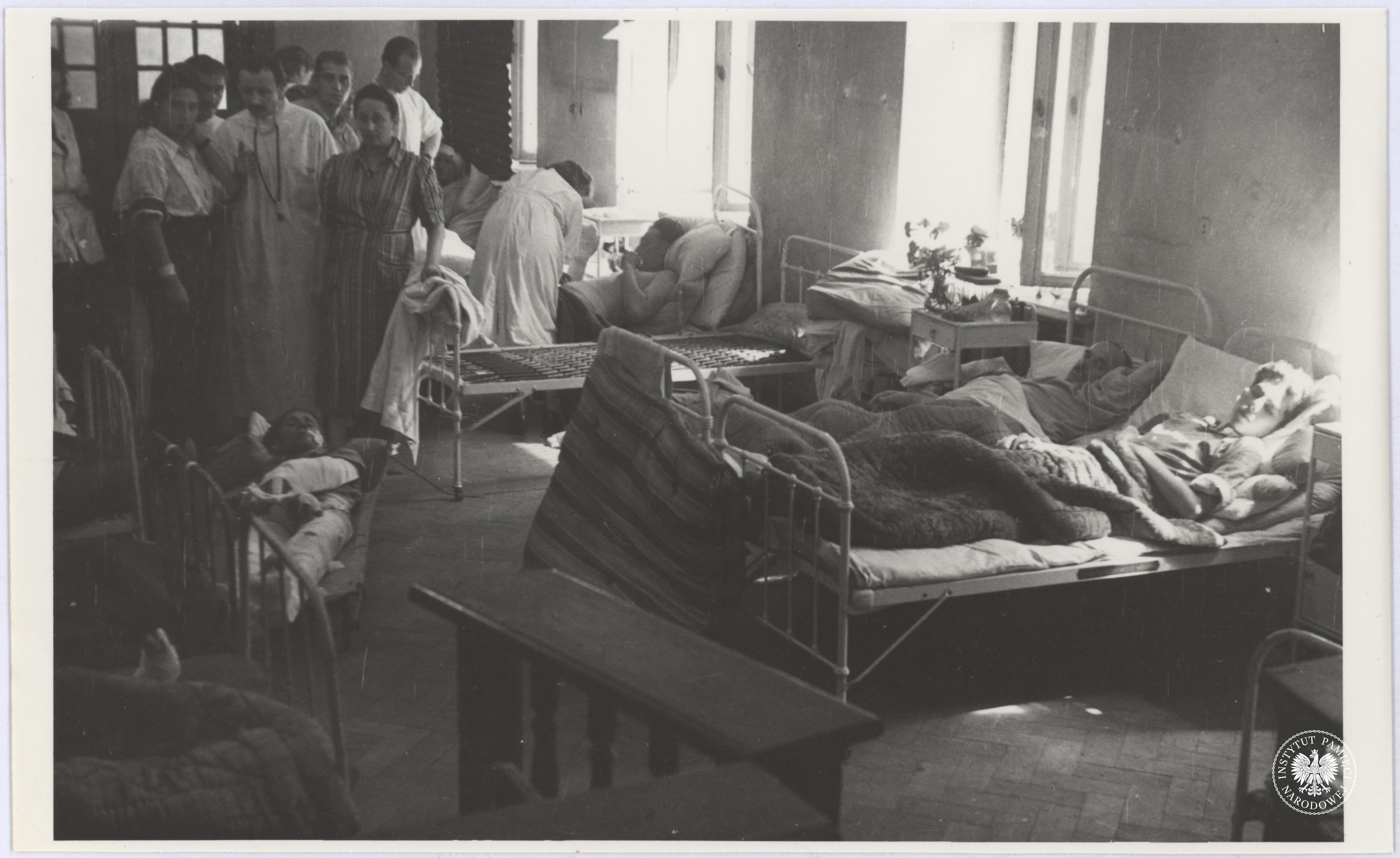 Personel medyczny i ranni powstańcy z oddziału AK w sali jednego ze szpitali powst. IV Zgrupowania Gurt przy ul. Złotej 22 lub 58, ewent. przy ul. Chmielnej 28, fot. H. Śmigacz,z zasobu IPN, sygn. IPNBU-2-21-32-5-1 -