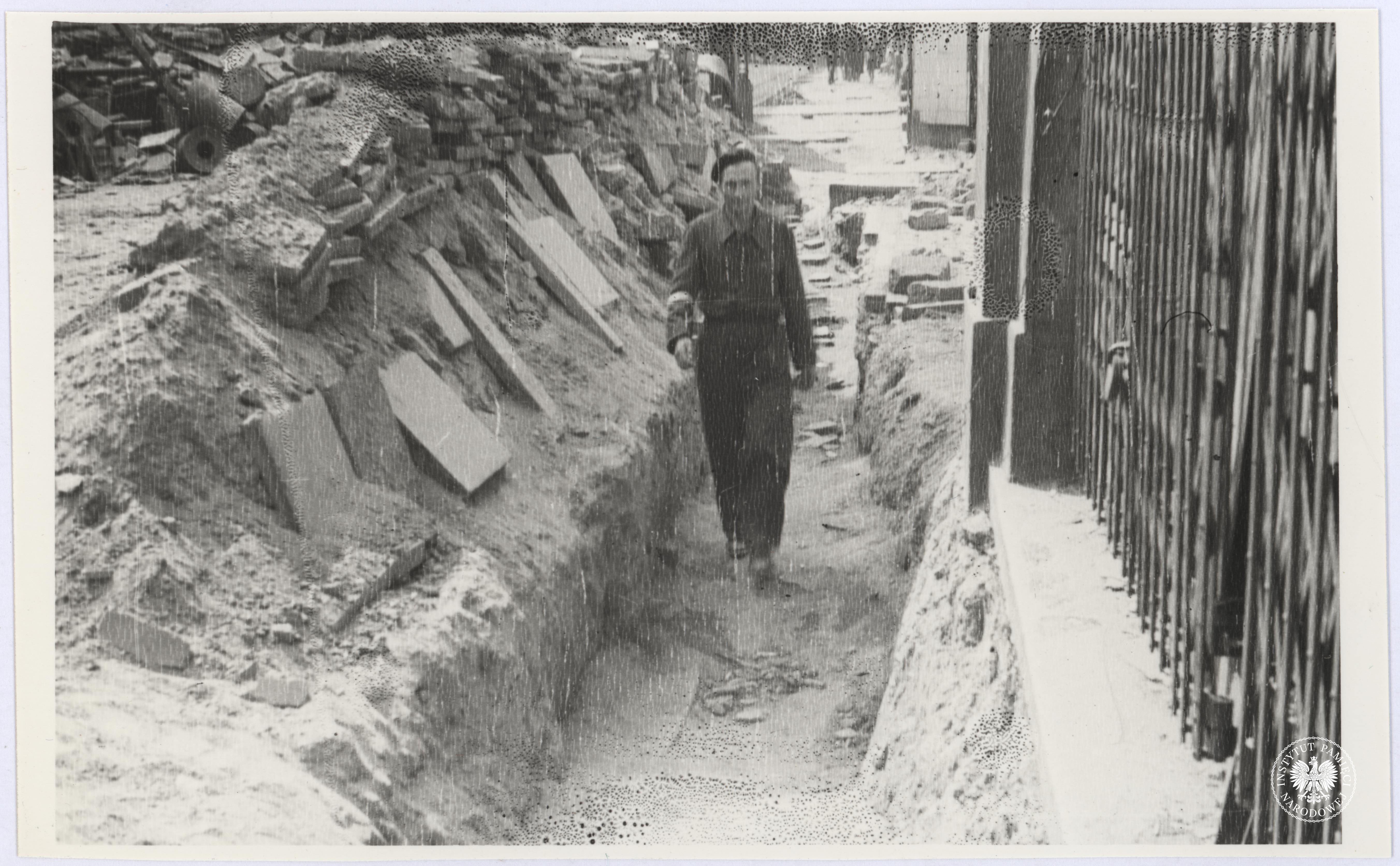Niezidentyfikowany powstaniec idzie wykopanym przejściem na jednej z ulic w Śródmieściu Północnym, fot. Henryk Śmigacz, z zasobu Archiwum IPN, IPNBU-2-21-29-1-1 -