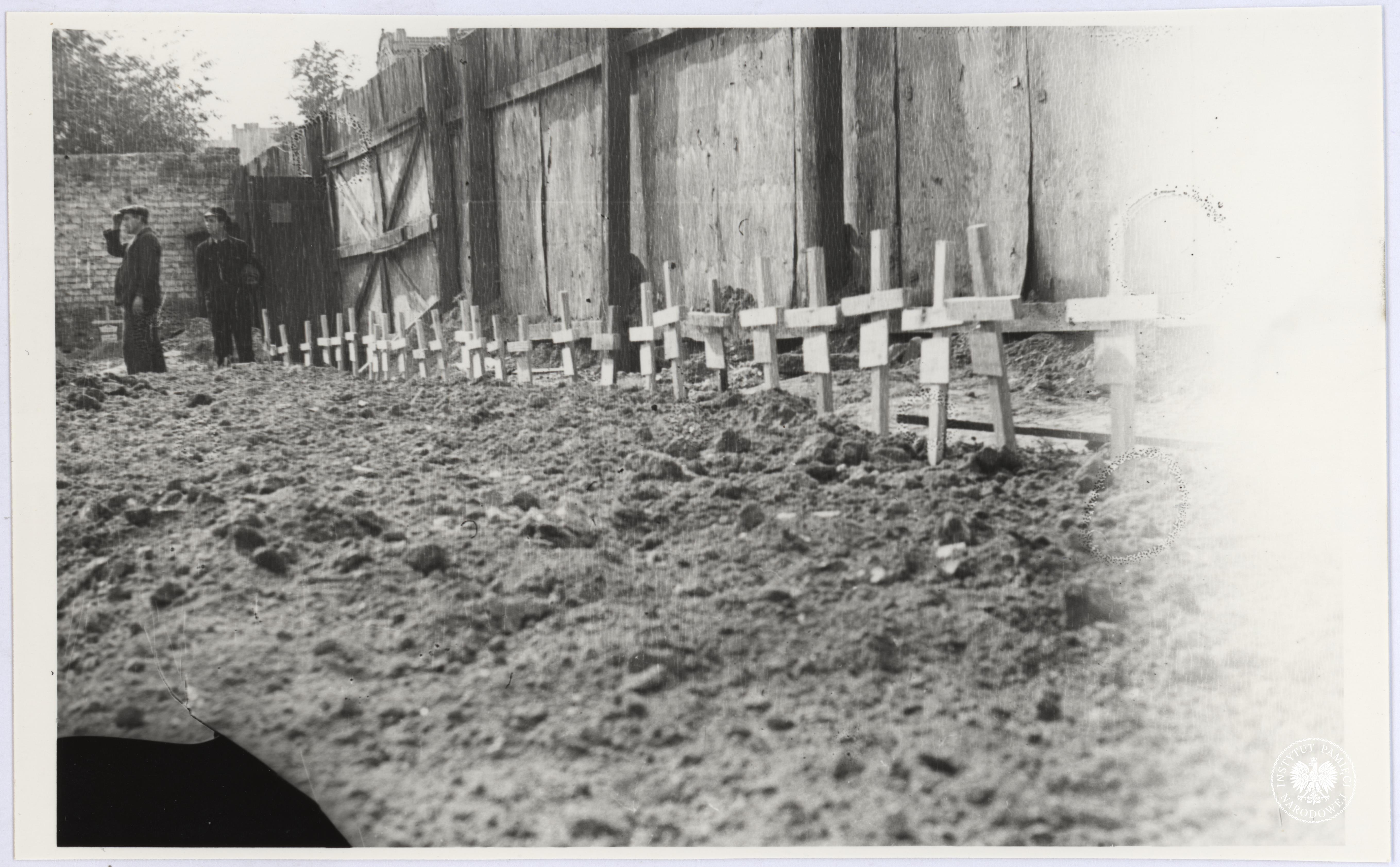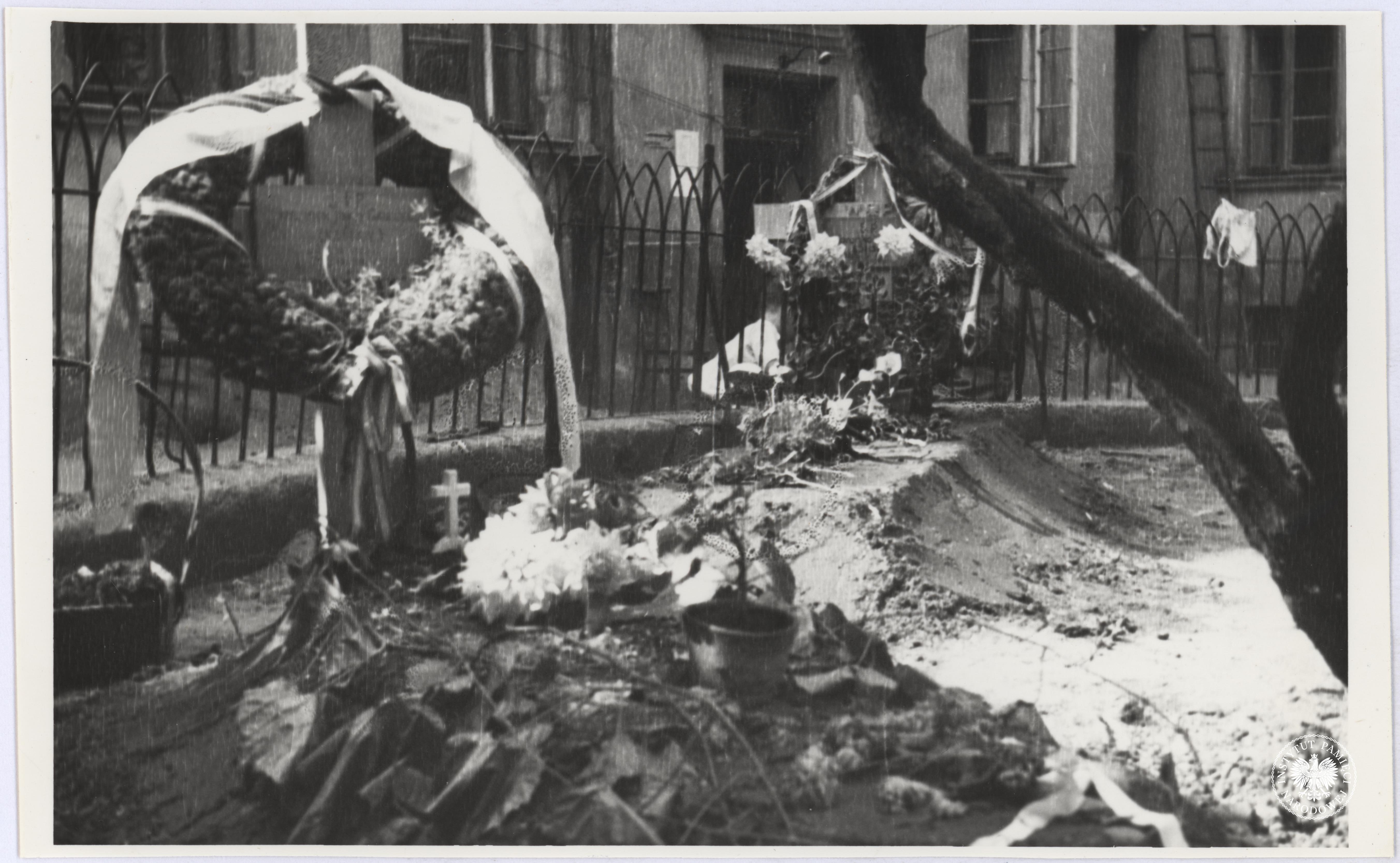 Dwie prowizoryczne mogiły ofiar na cmentarzu powstańczym na podwórzu jednej z posesji w Śródmieściu Północnym, fot. Henryk Śmigacz, z zasobu Archiwum IPN, sygn. IPNBU-2-21-33-2 -