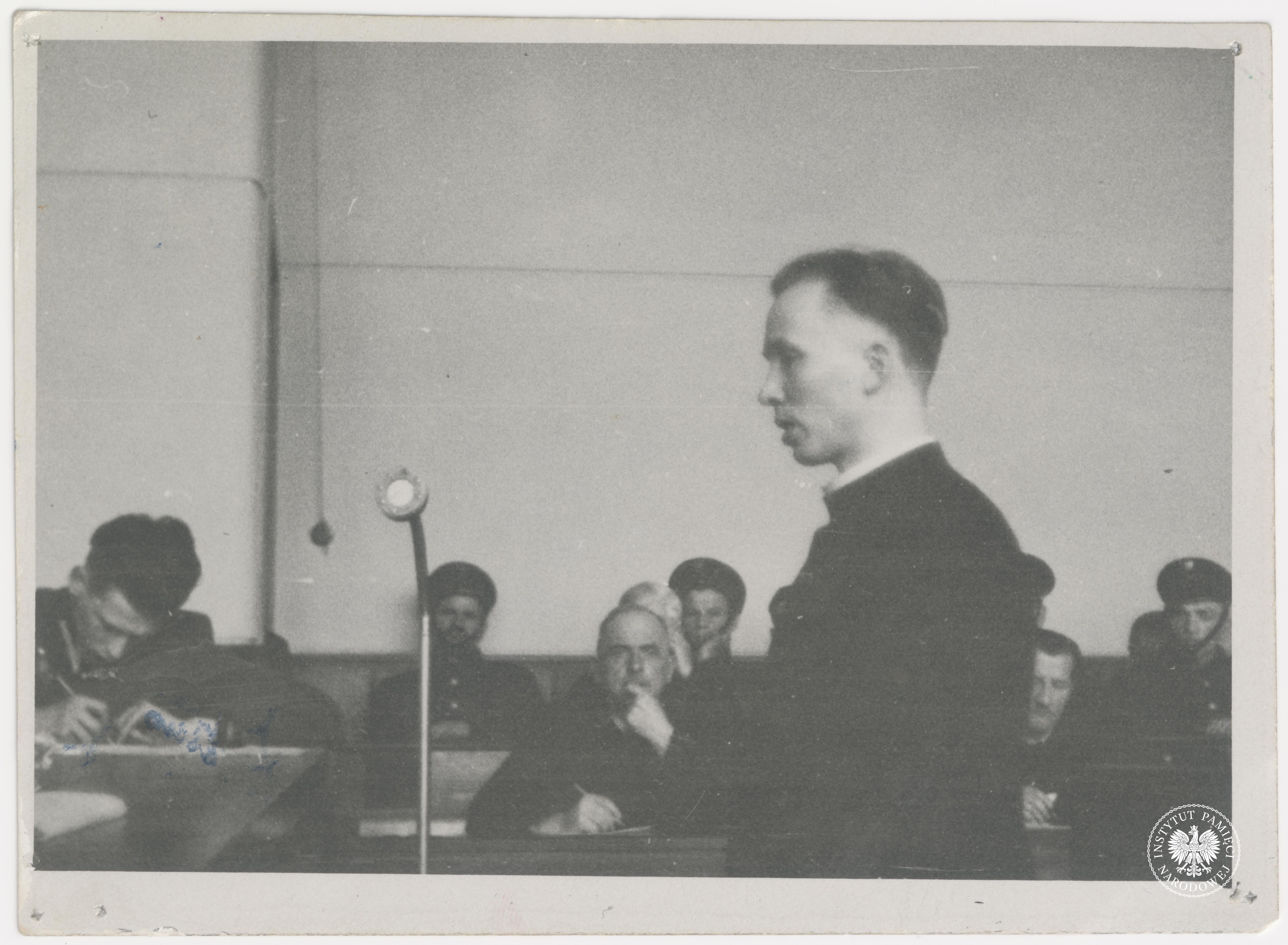 Ksiądz Michał Woś ps. Ursus zeznaje na sali sądowej Sądu Okręgowego w Przemyślu, NSZ AK, źródło AIPN, sygn. IPNBU-3-3-25-3-1 -