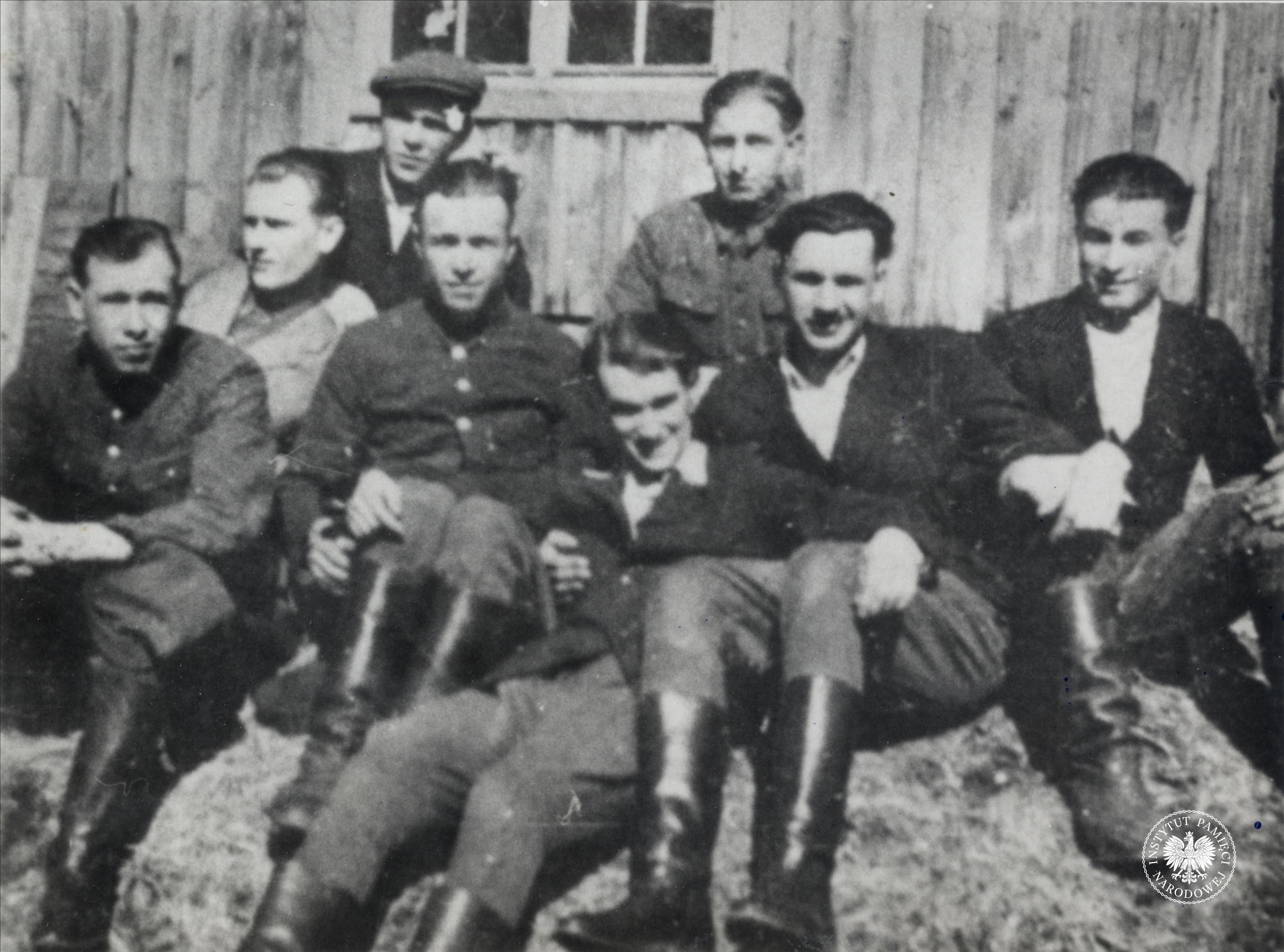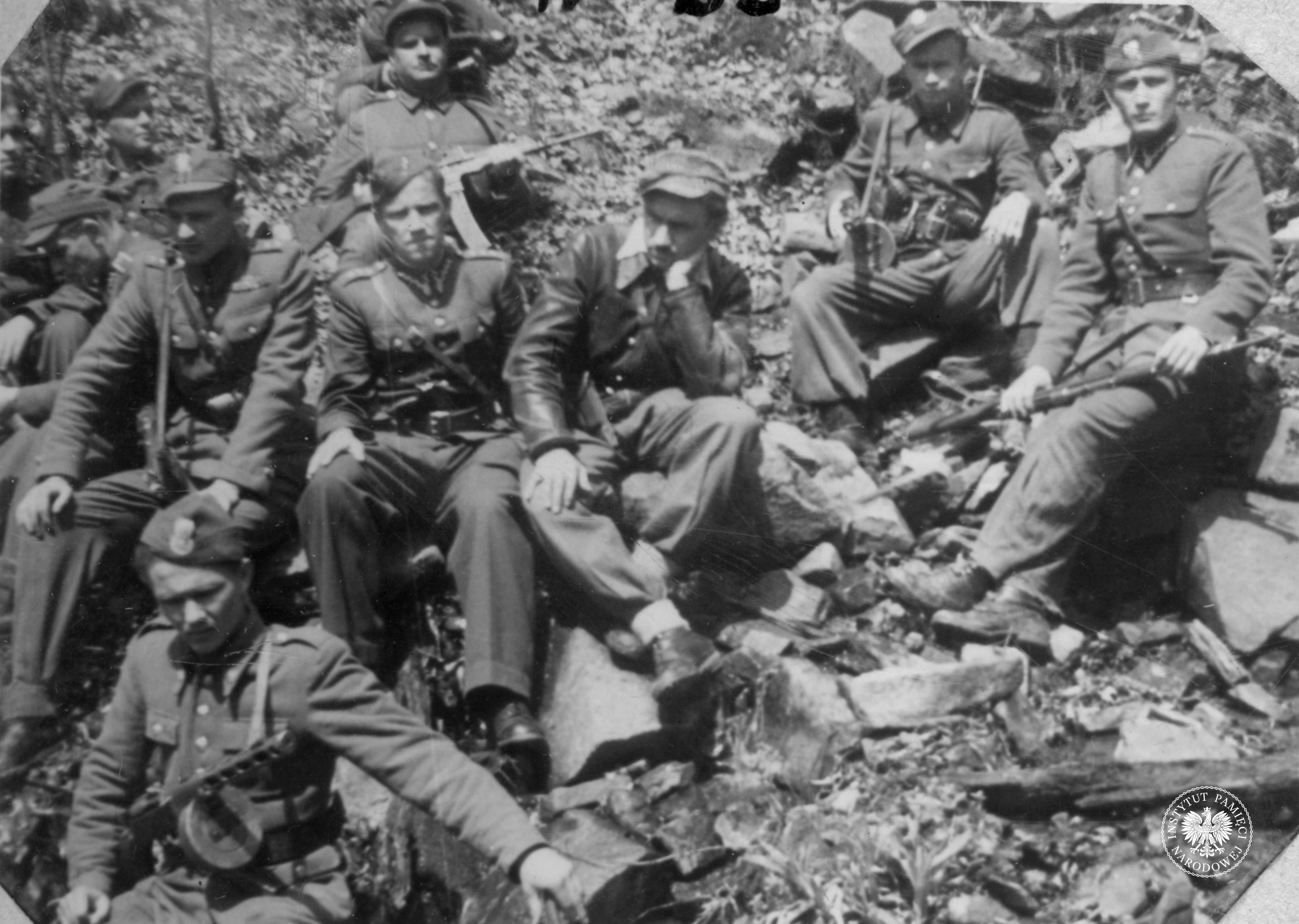Grupa żołnierzy NOW od prawej stoją NN, dowódca oddziału Gustaw Rafalski ps. Pogrom -3, Franciszek - 12, Węgrzyn ps. Poniatowski – 9, NN – 11, Mikołaj Mazur – 8, NN w okularach, NN – 13. Kucają od prawej NN ps. Tońka – 4, Jan Szymański – 6, Józef Walasek – 5, Jonak Stanisław – 7 , fot. AIPN, sygn. IPNKr-3-3-13-2-1 -