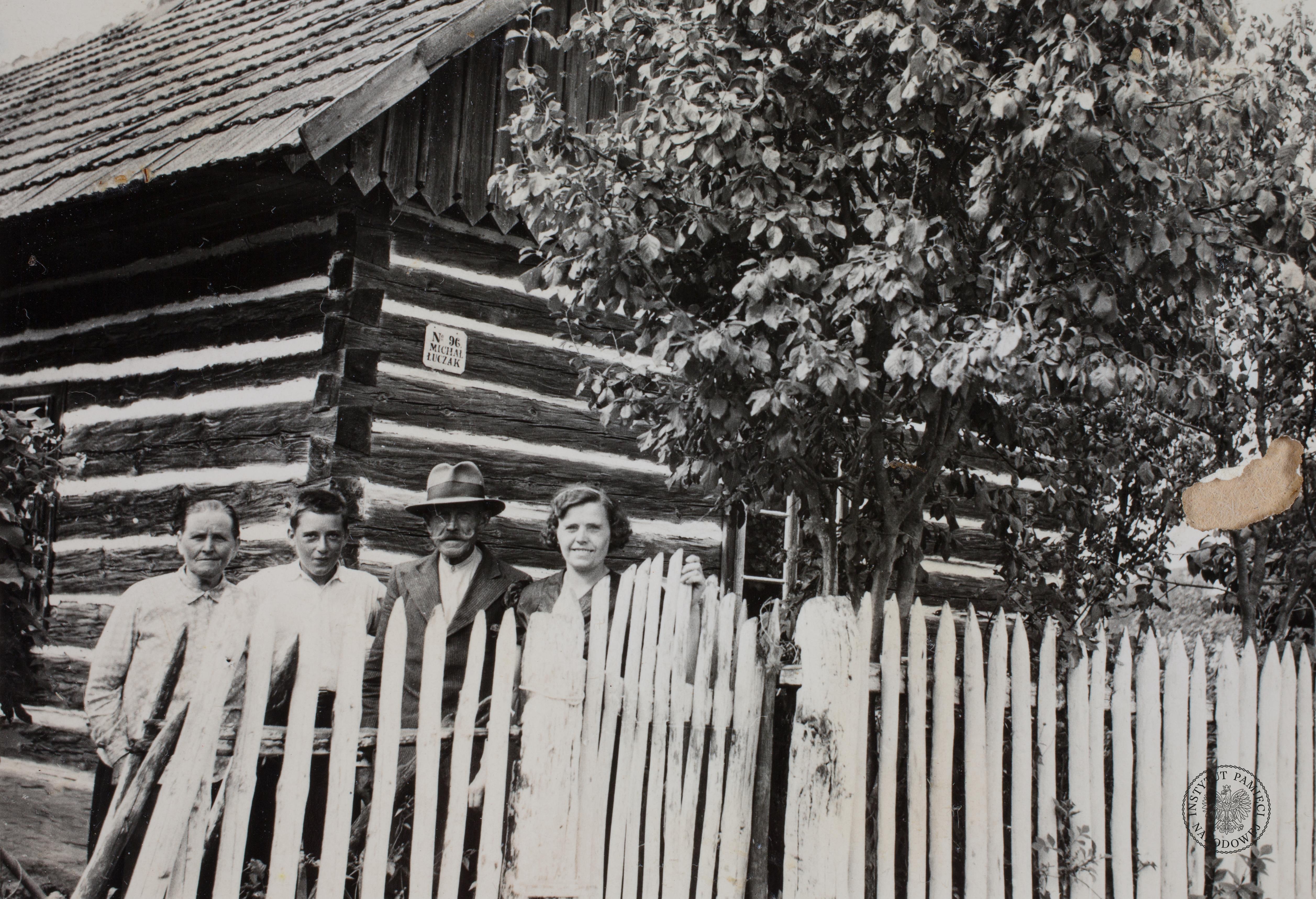 Tadeusz Gajda z rodziną przed domem Łuczaków. Drugi od prawej - dziadek Tadeusza, Michał Łuczak, fot. IPN, sygn. IPNRz-13-1-399-39-1 -
